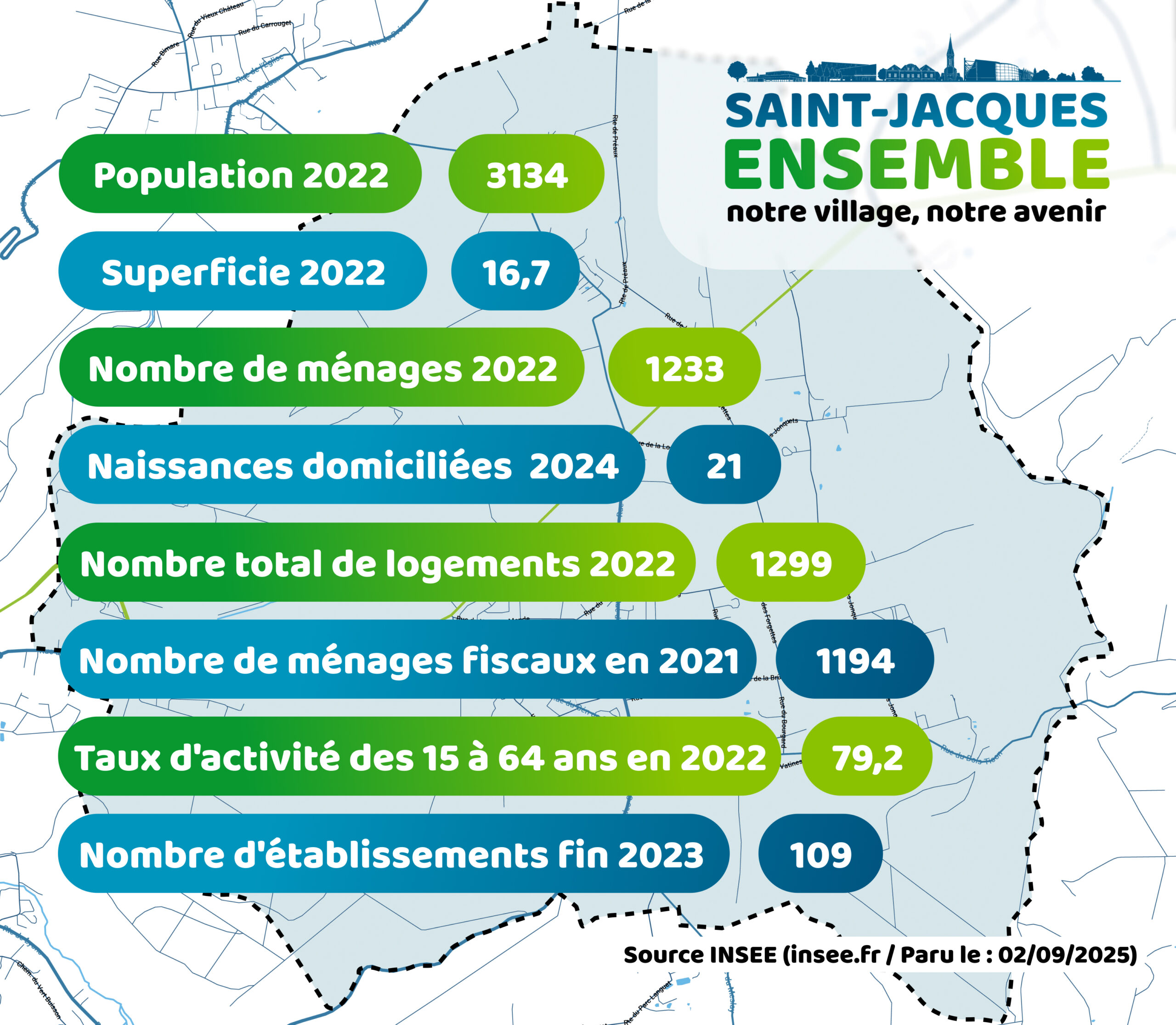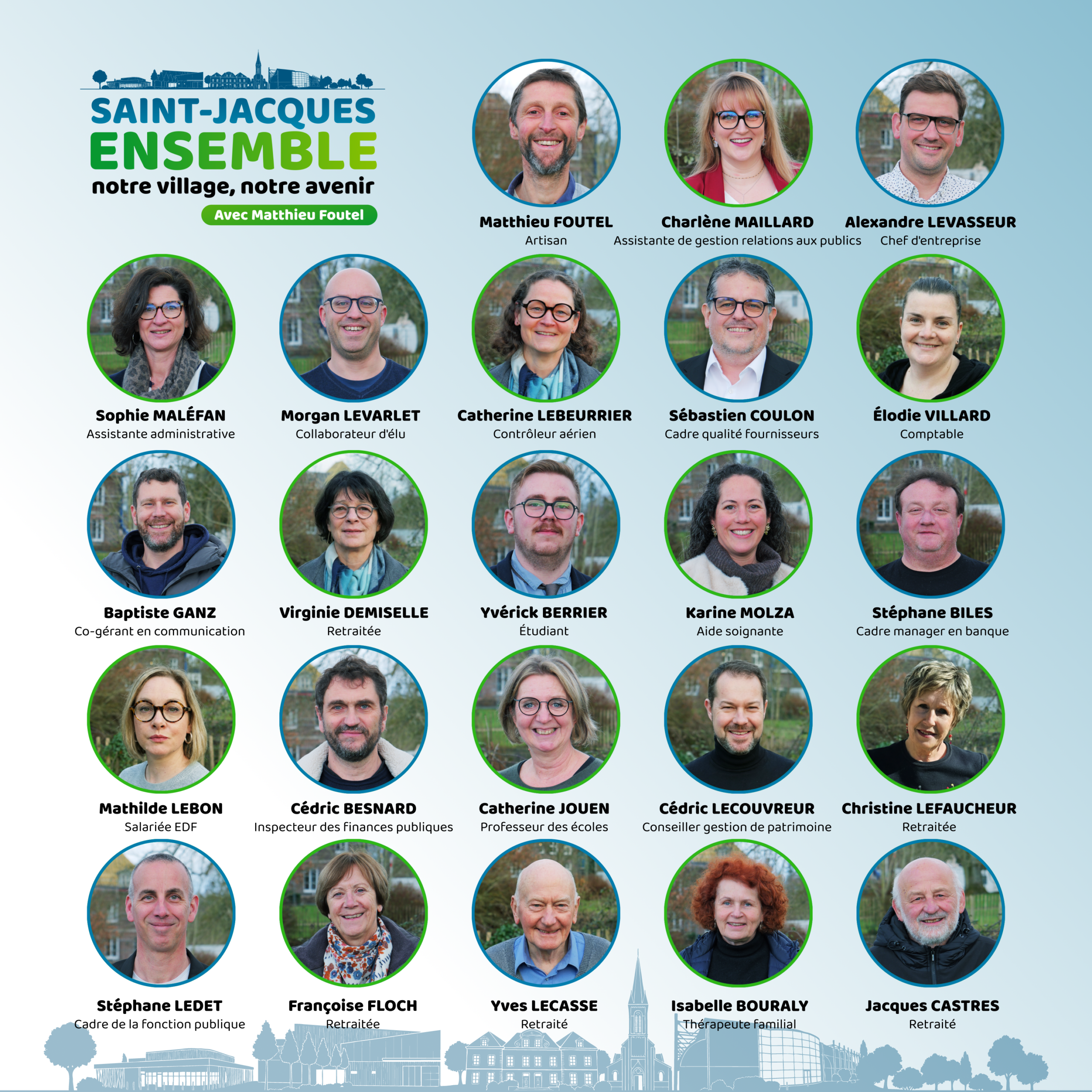Composée de femmes et d’hommes désireux de s’investir pour leur village, le groupe « Saint-Jacques, Ensemble » s’est constitué autour d’un socle de valeurs communes : Environnement, vivre ensemble, culture, valorisation du patrimoine.